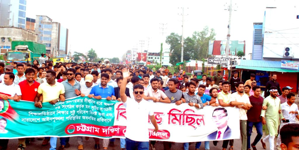 গোপন তৎপরতায় দীর্ঘদিন ধরে অভ্যস্ত গুপ্ত সংগঠন কর্তৃক মব সৃষ্টির অপচেষ্টা, শিক্ষাপ্রতিষ্ঠানে শিক্ষার সুষ্ঠু পরিবেশ বিনষ্ট করা এবং সারা দেশে আইনশৃঙ্খলা পরিস্থিতির অবনতির প্রতিবাদে দক্ষিণ জেলা ছাত্রদলের ব্যানারে বিক্ষোভ মিছিল ও প্রতিবাদ সভা অনুষ্ঠিত হয়।