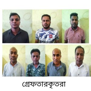 গ্রেপ্তারকৃতরা হলেন,বারশত ইউনিয়নের দুধকমুড়া গ্রামের নুরুল আবছার(৫৫),বৈরাগ ইউনিয়নের উত্তর বন্দর গ্রামের আবুল কালাম আজাদ (৫৩),সদর ইউনিয়নের ডুমুরিয়া গ্রামের আনিসুর রহমান আরফাত (২৬),হাইলধর ইউনিয়নের পীরখাইন গ্রামের মো. শফিউল আলম (২৬) ,পরৈকোড়া ইউনিয়নের ভিংরোল গ্রামের মোহাম্মদ এরফান (৩১), বারশত ইউনিয়নের দুধকুমড়া গ্রামের মো. কাশেম (৪৫) ও হাইলধর ইউনিয়নের তেকোঠা গ্রামের মোস্তাক আহমেদ।