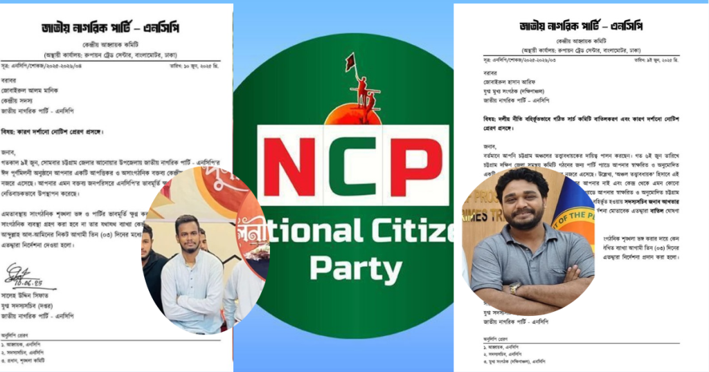এনসিপির যুগ্ম সদস্যসচিব (দপ্তর) সালেহ উদ্দিন সিফাত স্বাক্ষরিত পর পর দুটি নোটিশে তিন কার্যদিবসের মধ্যে তাদের ব্যাখ্যা দিতে বলা হয়েছে।