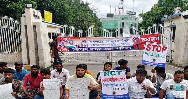 চট্টগ্রাম বন্দরের নিউমুরিং কনটেইনার টার্মিনাল (এনসিটি) বিদেশিদের হাতে ছেড়ে দেওয়ার সিদ্ধান্তের প্রতিবাদে রবিবার (২৫ মে) সকাল ১০টায় বন্দর ভবনের ফটকের সামনে অবস্থান ধর্মঘট পালন করছে জাতীয়তাবাদী শ্রমিকদল চট্টগ্রাম বন্দর শাখা । ‘এনসিটি বেসরকারিকরণের সিদ্ধান্ত বাতিল করতে হবে’, ‘ভাড়াটিয়া লোক দিয়ে বন্দর পরিচালনা চাই না’ ইত্যাদি প্ল্যাকার্ড নিয়ে এ কর্মসূচিতে অবস্থান করছেন তারা।