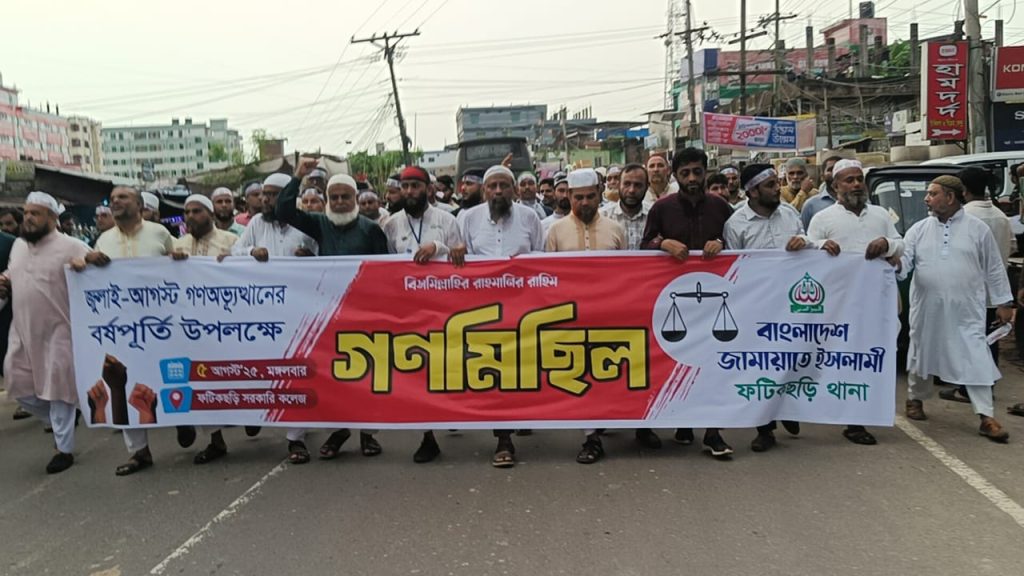 ৫ আগস্ট গণঅভ্যুত্থানের বর্ষপূর্তি উপলক্ষে বাংলাদেশ জামায়াতে ইসলামীর ফটিকছড়ি থানা শাখার উদ্যোগে এক বর্ণাঢ্য গণমিছিল ও সংক্ষিপ্ত সমাবেশ অনুষ্ঠিত হয়েছে।