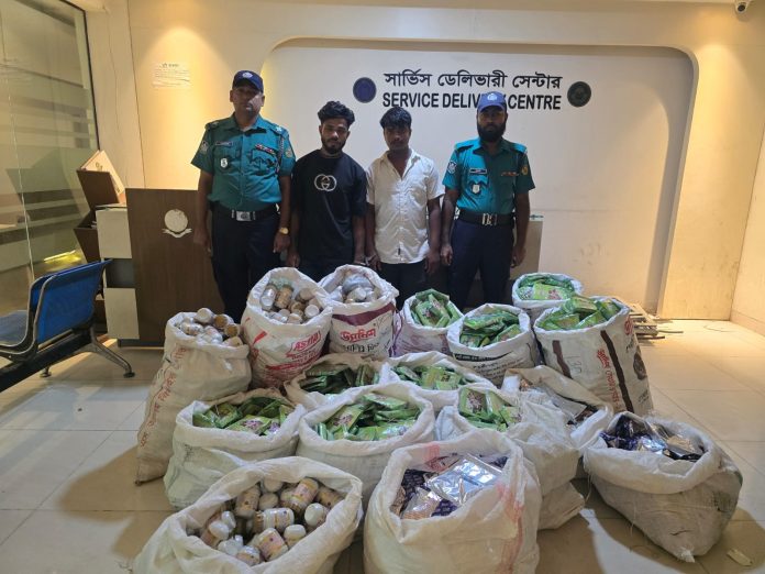 গ্রেপ্তার হওয়া দুই যুবক হলো আমীর হোসেন (২২) ও কফিল উদ্দিন (২০)। অভিযানে তিন বস্তা ট্যাবলেট কৌটা, আট বস্তা ন্যাচারাল ড্রিংকিং পাউডার এবং তিন বস্তা নীল পাউডার উদ্ধার করে পুলিশ।