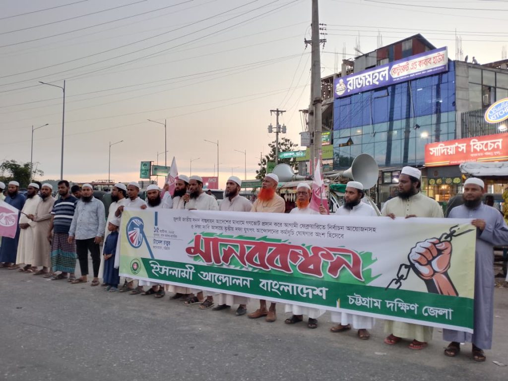 পিআর পদ্ধতিতে জাতীয় নির্বাচনসহ পাঁচ দফা দাবি বাস্তবায়নের দাবিতে ইসলামী আন্দোলন বাংলাদেশ চট্টগ্রাম দক্ষিণ জেলার উদ্যোগে মানববন্ধন অনুষ্ঠিত হয়েছে।