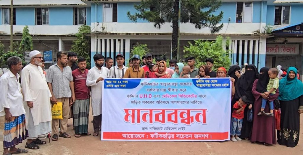 চট্টগ্রামের ফটিকছড়ি উপজেলা স্বাস্থ্য ও পরিবার পরিকল্পনা কর্মকর্তা ডা. সৌনম বড়ুয়ার অপসারণের দাবিতে মানববন্ধন অনুষ্ঠিত হয়েছে।