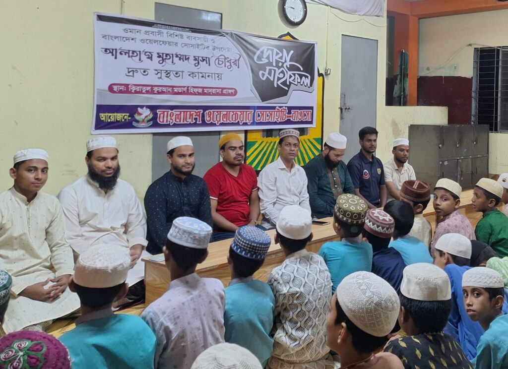 বাংলাদেশ ওয়েলফেয়ার সোসাইটির (বাওসো) উপদেষ্টা, ওমান প্রবাসী বিশিষ্ট ব্যবসায়ী ও সমাজসেবক আলহাজ্ব মুহাম্মদ মুসা চৌধুরীর দ্রুত আরোগ্য কামনায় এক দোয়া মাহফিল অনুষ্ঠিত হয়েছে।