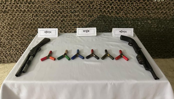 আস্তানায় তল্লাশি করে ২টি শটগানসহ ১৮ রাউন্ড তাজা বুলেট উদ্ধার করা হয়েছে।