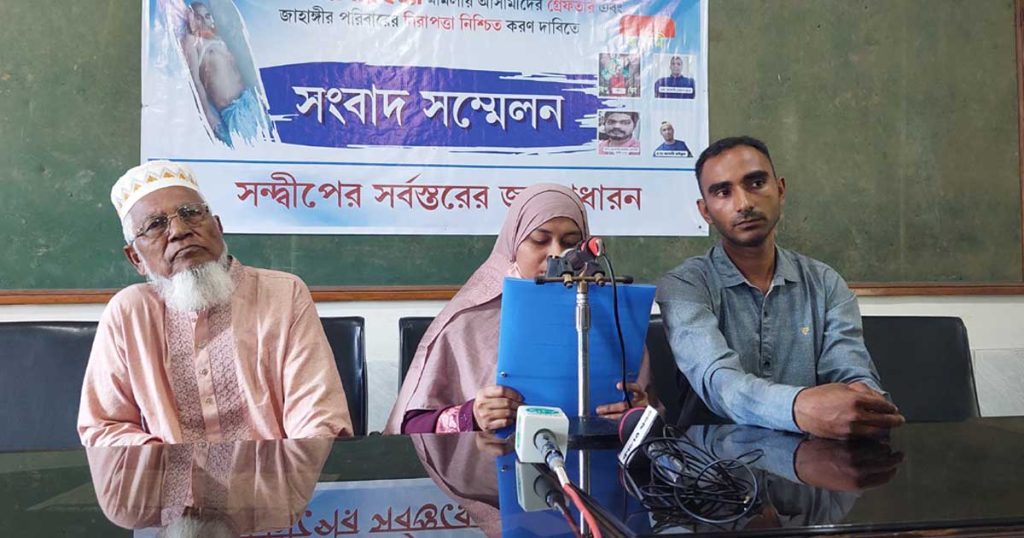 সন্দ্বীপে জাহাঙ্গীর হত্যা মামলার আসামিদের গ্রেপ্তার এবং পরিবারের নিরাপত্তা নিশ্চিতের দাবিতে শনিবার (১২ এপ্রিল) চট্টগ্রাম মেট্রোপলিটন সাংবাদিক ইউনিয়ন মিলনায়তনে সংবাদ সম্মেলন করেছে নিহতের পরিবার। এতে আসামিদের দ্রুত গ্রেপ্তার করে আইনের আওতায় আনতে প্রধান উপদেষ্টা ও স্বরাষ্ট্র উপদেষ্টার নিকট দাবি জানানো হয়।