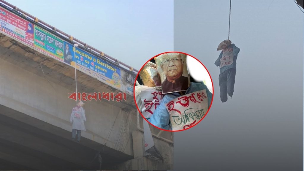 বুধবার বিকেল ৫ টার দিকেও চট্টগ্রাম ওয়াসার মোড় আখতারুজ্জামান ফ্লাইওভারের উপর থেকে ঝুলতে দেখা যায় ওই কুশপুত্তলিকা। যার বুকে সাদা কাগজে লাল কালিতে ড. ইউনুসের নাম ও মুখে তাঁর ছবি সাঁটানো আছে। তবে বাংলাধারায় এ সংক্রান্ত একটি ভিডিও প্রকাশ করা হয়। কিন্তু ইফতারের পর ঝুলতে থাকা কুশপুত্তলিকা আর দেখা যায়নি।