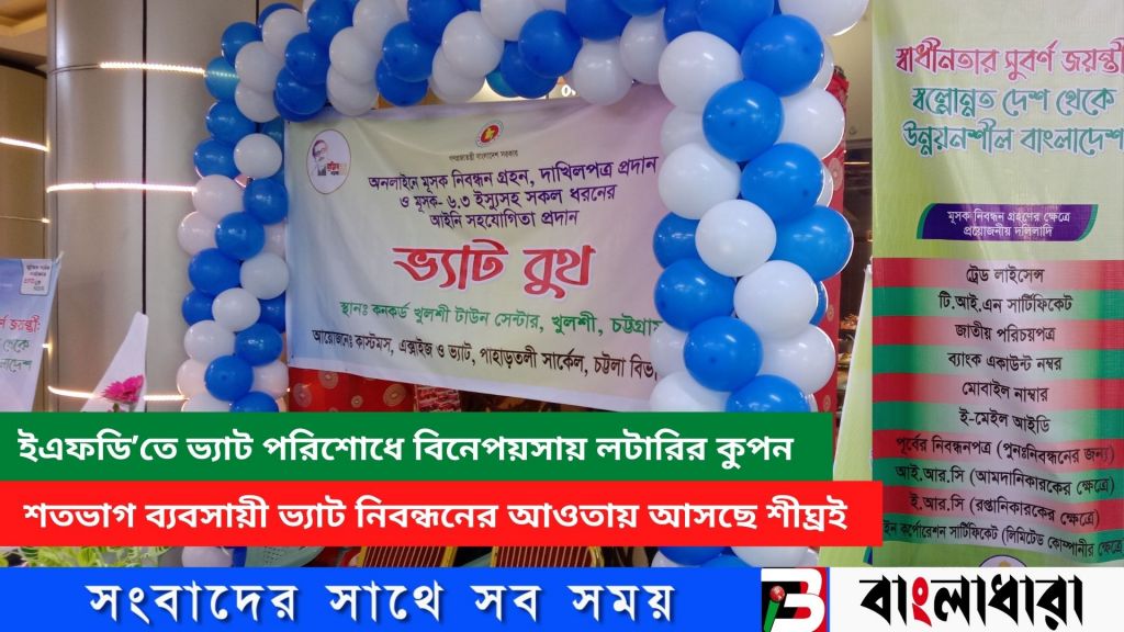 এমনই একটি উদ্যোগ নেয়া হয়েছে বুধবার। নগরীর খুলশী থানাধীন কনকর্ড টাউন সেন্টারে দু’দিন ব্যাপী ভ্যাট নিবন্ধনের বুথ খোলা হয়েছে। কাল বৃহস্পতিবার পর্যন্ত ভ্যাট কর্মকর্তারা ব্যবসায়ীদের ভ্যাট নিবন্ধন করে দিবেন অনলাইনে। কাস্টমস, এক্সাইজ ও ভ্যাট পাহাড়তলী সার্কেলের পক্ষ থেকে ব্যবসায়ীদের এ ধরনের সেবা প্রদান করা হচ্ছে। বুধবার দুপুরে এ বুথের আনুষ্ঠানিক উদ্বোধন করেন চট্টগ্রাম জেলার কাস্টমস এক্সসাইজের ডেপুটি কমিশনার অব কাস্টমস সৈয়দ আহম্মদ রুবেল। ফিতা কেটে তিনি ভ্যাট নিবন্ধন বুথের শুভ সূচনা করেন। এসময় এই শপিং মলের ব্যবসায়ী সমিতির সভাপতি সৈয়দ জালাল আহম্মেদ রুম্মন, যুগ্ন সম্পাদক জহির উদ্দিন মোহাম্মদ বাবর ও বিভিন্ন ব্যবসায়ীরা উপস্থিত ছিলেন।