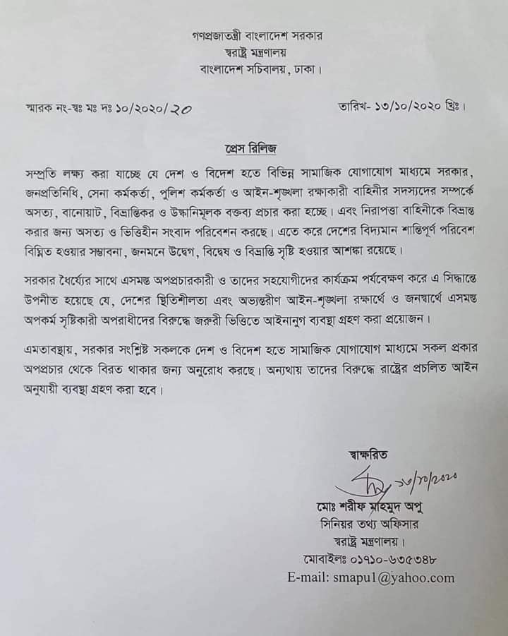 এ অবস্থায় সরকার সংশ্লিষ্ট সবাইকে দেশ-বিদেশ থেকে সামাজিক যোগাযোগমাধ্যমে সব ধরনের অপপ্রচার থেকে বিরত থাকার জন্য অনুরোধ করছে। অন্যথায় তাদের বিরুদ্ধে রাষ্ট্রের প্রচলিত আইন অনুযায়ী ব্যবস্থা গ্রহণ করা হবে বলে জানানো হয় বিজ্ঞপ্তিতে।