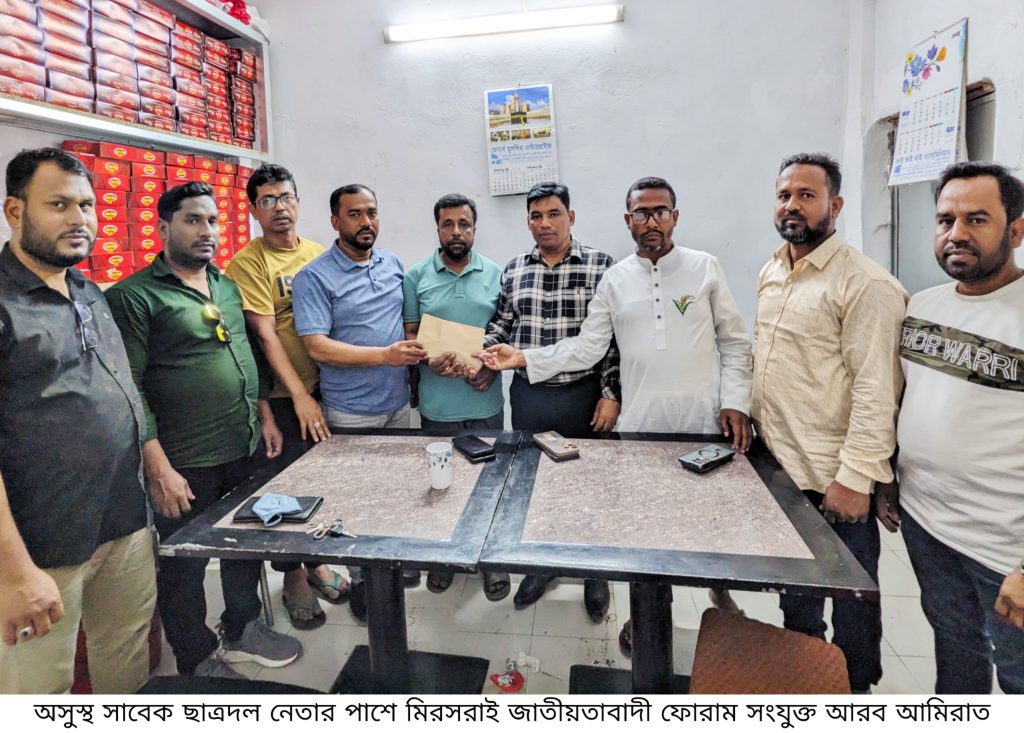 চট্টগ্রামের মিরসরাইয়ে অসুস্থ সাবেক ছাত্রদল নেতা মোহাম্মদ সালাউদ্দিনের পাশে দাঁড়িয়েছে মিরসরাই জাতীয়তাবাদী ফোরাম সংযুক্ত আরব আমিরাত। মঙ্গলবার (১১ মার্চ) দুপুরে উপজেলা মঘাদিয়া ইউনিয়নের সাবেক ছাত্রদল নেতা মোহাম্মদ সালাউদ্দিনের হাতে তার চিকিৎসার জন্য আর্থিক অনুদান দেওয়া হয়েছে।