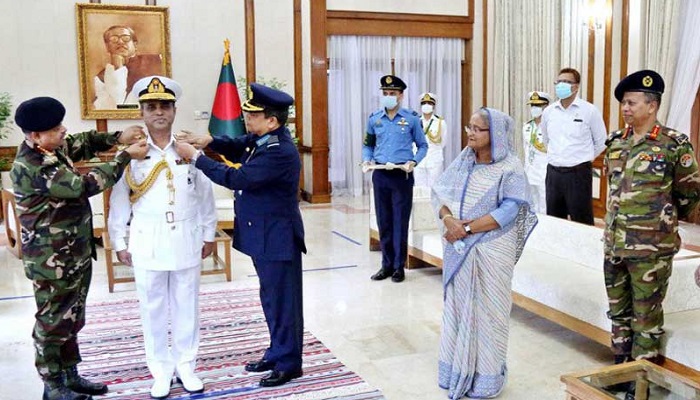 বৃহস্পতিবার প্রধানমন্ত্রী শেখ হাসিনার উপস্থিতিতে সেনাবাহিনী প্রধান জেনারেল আজিজ আহমেদ ও বিমান বাহিনী প্রধান এয়ার চিফ মার্শাল মাসিহুজ্জামান সেরনিয়াবাত নৌবাহিনী প্রধানকে অ্যাডমিরাল র‌্যাঙ্ক ব্যাজ পরিয়ে দেন।