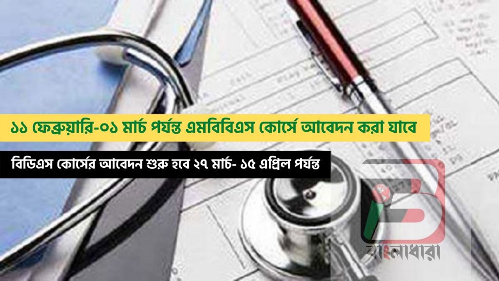 এছাড়া, বিডিএস কোর্সের আবেদন শুরু হবে ২৭ মার্চ। ১৫ এপ্রিল পর্যন্ত আবেদনপত্র গ্রহণ করা হবে আর ডেন্টালে ভর্তি পরীক্ষার প্রবেশপত্র ২৪ থেকে ২৬ এপ্রিল পর্যন্ত বিতরণ করা হবে।
