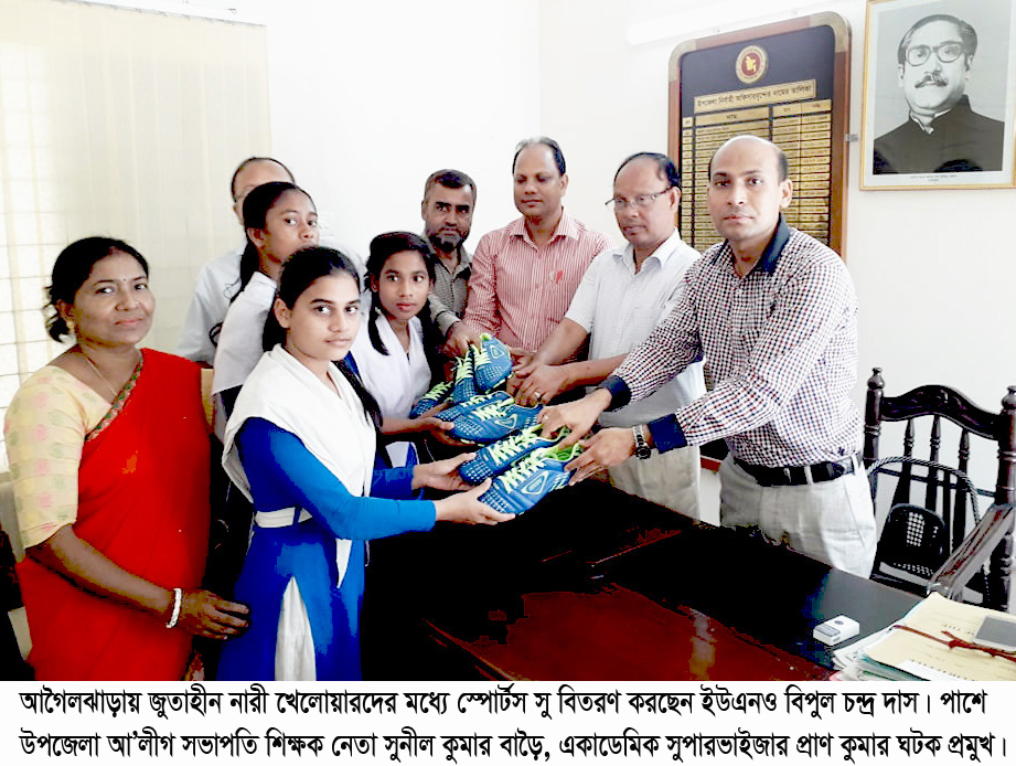 গতকাল দুপুরে ইউএনও’র কার্যালয়ে শ্রীমতি মাতৃমঙ্গল বালিকা বিদ্যালয়ের ক্রীড়া টিমের জুতাহীন শিক্ষার্থীদের হাতে উপহার হিসেবে খেলার নতুন জুতা তুলে দেন। এসময় উপস্থিত ছিলেন উপজেলা আওয়ামী লীগ সভাপতি সুনীল কুমার বাড়ৈ, একাডেমিক সুপারভাইজার প্রাণ কুমার ঘটক, বিদ্যালয়ের প্রধান শিক্ষক হারুন-অর-রশিদ, সহকারী প্রধান শিক্ষক নির্মলেন্দু বাড়ৈসহ উপজেলার বিভিন্ন কর্মকর্তা ও ক্রীড়া সংস্থার নেতৃবৃন্দ।