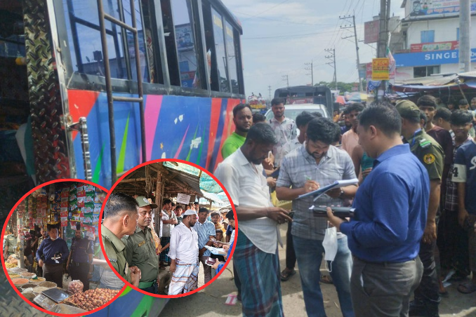 এসময় মুদির দোকানগুলোতে দ্রব্যমূল্যের তালিকা না থাকা এবং মাংসের দোকানে ওজনে কম দেওয়া ও সড়কের নির্দিষ্ট জায়গায় বাস না দাঁড়ানোর অপরাধে বাস চালককেও জরিমানা করা হয়।