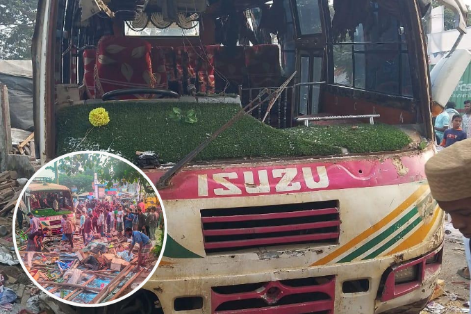 এ সময় রাস্তার পাশে দাঁড়িয়ে থাকা একটি সিএনজিচালিত অটোরিকশা বাসটির নিচে চাপা পড়ে সম্পূর্ণ চূর্ণবিচূর্ণ হয়ে যায়। তবে দুর্ঘটনার সময় দোকানদাররা বাইরে অবস্থান করায় তারা প্রাণে বেঁচে যান।