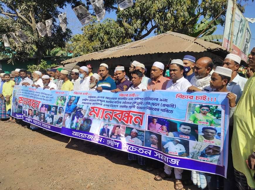 শুক্রবার (৪ ফেব্রুয়ারি) জুমার নামাযের পর সচেতন সমাজের ব্যানারে গুন্দীপ আসকর আলী জামে মসজিদের সামনে এলাকাবাসী এই মানববন্ধন করেন। এ ঘটনায় তার ছেলে সরওয়ারও আহত হন।
