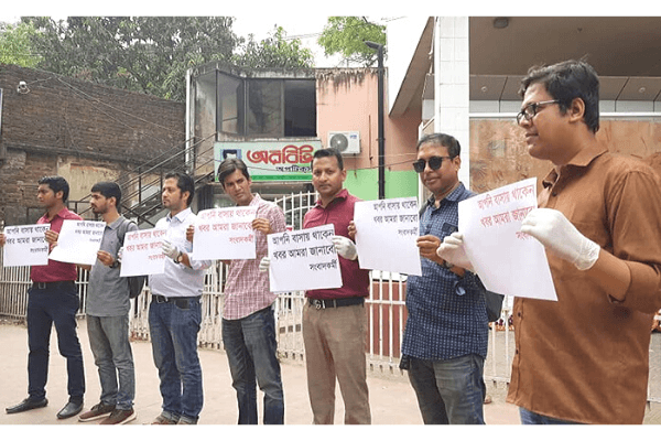 শনিবার (২১ মার্চ) বেলা বারোটার দিকে নগরীর প্রেসক্লাবের সামনে ‘আপনি বাসায় থাকেন, খবর আমরা জানাবো’ লিখা প্ল্যাকার্ড নিয়ে ব্যক্তিগত উদ্যোগে জনসচেতনতামূলক এ মানববন্ধন করেন তারা।