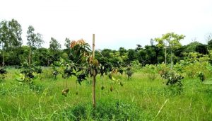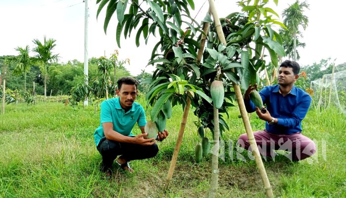 দ্রুত ফলন পেতে বারি-৪, বারি-৩, থাইল্যান্ডের কাটিমন ও কিউজাই জাতের আমের কলম লাগিয়েছিলেন তাঁরা। বারোমাসী আমও রয়েছে এ বাগানে।