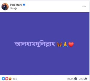 এর পরপরেই আলহামদুলিল্লাহ্ লিখে ফেইসবুক পোস্ট করেন পরীমনি ।