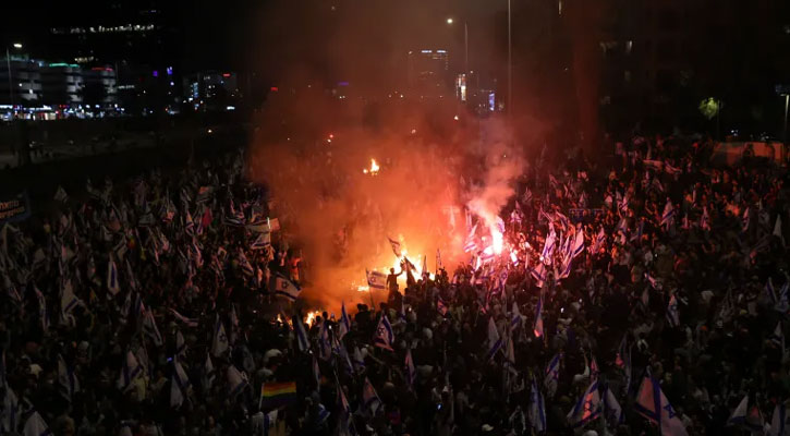 আল জাজিরার প্রতিবেদনে বলা হয়, তেল আবিবে স্থানীয় সময় রোববার (২৬ মার্চ) গভীর রাতে গায়ে নীল, সাদা রঙের পতাকা জড়ানো বিক্ষোভকারীরা প্রধান একটি মহাসড়ক অবরোধ করে। এছাড়াও তারা সেখানে আগুন ধরিয়ে প্রতিবাদ জানায়।