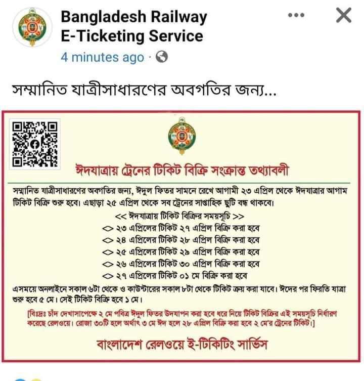 আগামী ২৩ এপ্রিল বিক্রি হবে ২৭ এপ্রিল যাত্রার টিকেট, ২৪ এপ্রিল বিক্রি হবে ২৮ এপ্রিল যাত্রার টিকেট, ২৫ এপ্রিল বিক্রি হবে ২৯ এপ্রিল যাত্রার টিকেট, ২৬ এপ্রিল বিক্রি হবে ৩০ এপ্রিল যাত্রার টিকেট, ২৭ এপ্রিল বিক্রি হবে ০১মে যাত্রার টিকেট। যদি আগামী ১মে সন্ধ্যায় ঈদের চাঁদ দেখা না যায় তাহলে ঐদিন সন্ধ্যার পর থেকে ২মে তারিখের টিকেট পাওয়া যাবে কাউন্টারে। অগ্রিম টিকেট বিক্রির এ কার্যক্রমে কোন ধরনের রিটার্ন বা ফরোয়ার্ড টিকেট করা যাবে না। ঢাকা ও চট্টগ্রাম স্টেশন থেকে বিশেষ ব্যবস্থায় অগ্রিম টিকেট বিক্রি কার্যক্রম সকাল ৯টা থেকে বিকেল ৫টা পর্যন্ত কাউন্টারে টিকেট থাকা শর্তে বিক্রির কথা রয়েছে। কিন্তু টিকেট বিক্রি শেষ না হওয়া পর্যন্ত রাতেও বিক্রি অব্যাহত থাকবে ছিল।