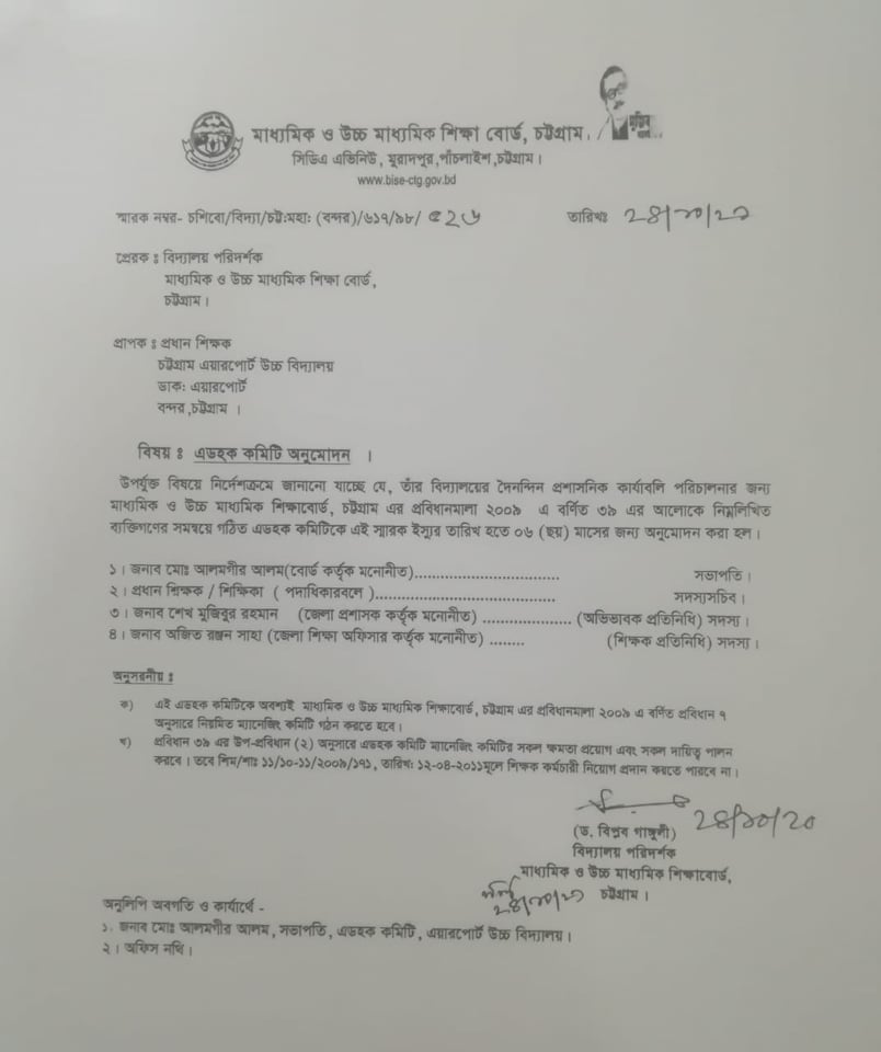 চট্টগ্রাম এয়ারপোর্ট উচ্চবিদ্যালয়ের পরিচালনা পর্ষদের অ্যাডহক কমিটি গঠন করা হয়েছে।