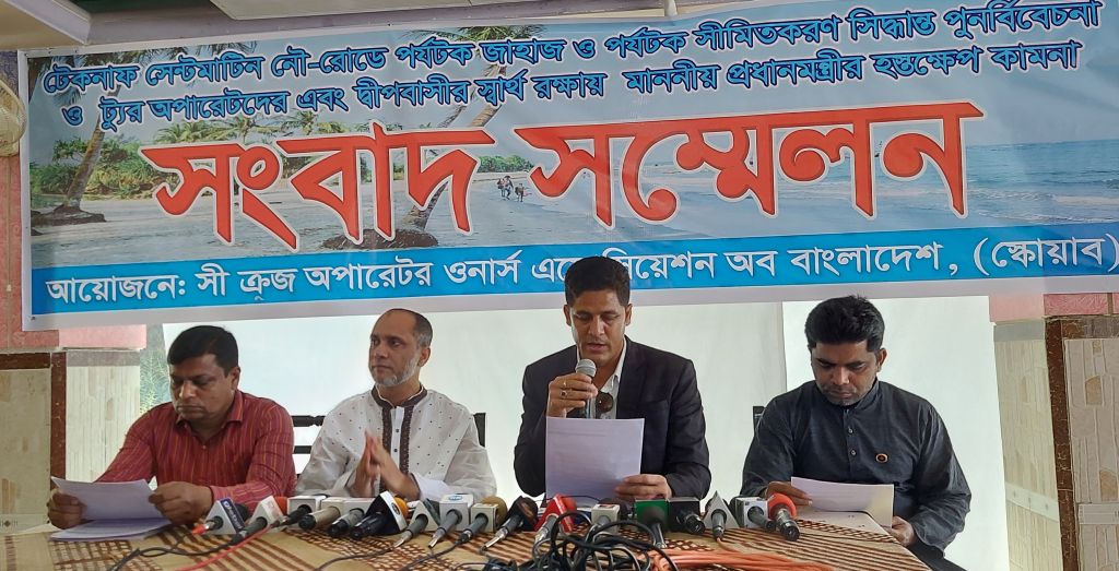 বুধবার (২৩ ফেব্রুয়ারি) দুপুরে কক্সবাজার সৈকত এলাকার হোটেল মিশুকের রেস্তোরাঁয় আয়োজিত ‘টেকনাফ সেন্টমার্টিন নৌ-রোডে পর্যটক জাহাজ ও পর্যটক সীমিতকরণ সিদ্ধান্ত পুনর্বিবেচনা ও ট্যুর অপারেটর এবং দ্বীপবাসীর স্বার্থ রক্ষায় মাননীয় প্রধানমন্ত্রীর হস্তক্ষেপ কামনা’ শীর্ষক সংবাদ সম্মেলন তারা এসব কথা বলেছেন।