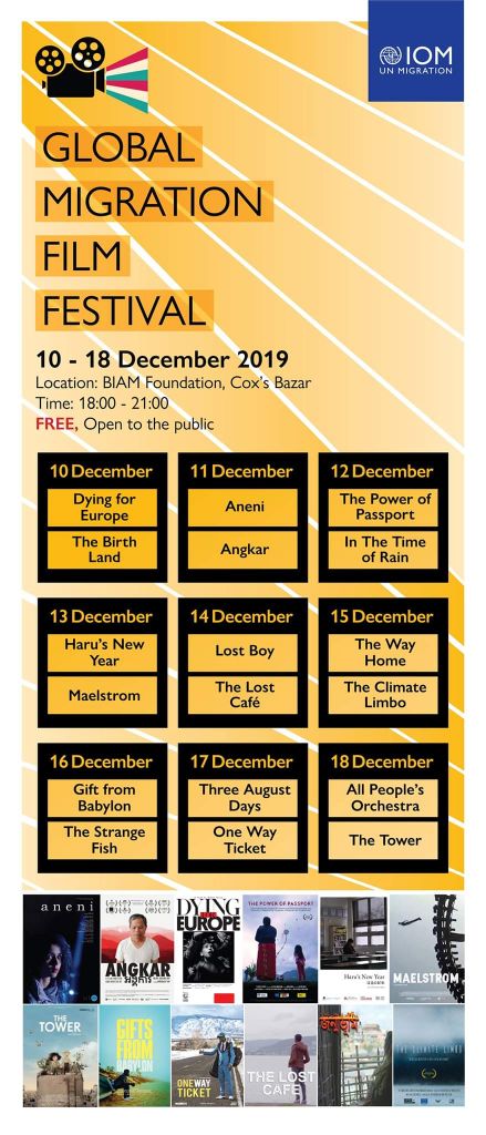 কক্সবাজারে চলচ্চিত্র প্রদর্শনী গ্লোবাল মাইগ্রেশন ফিল্ম ফেস্টিভাল (জিএমএফএফ)-এর আয়োজন করছে আন্তর্জাতিক অভিবাসন সংস্থা (আইওএম )। বিশ্বের বিভিন্ন দেশের অভিবাসন-বিষয়ক চলচ্চিত্র প্রদর্শিত হবে এই আয়োজনে।