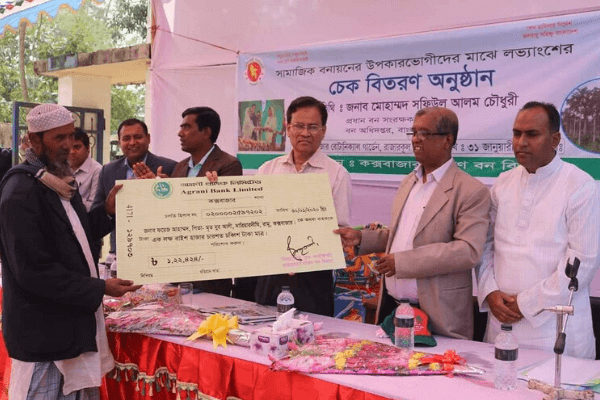কক্সবাজার দক্ষিণ বন বিভাগের রাজারকুল রেঞ্জের ২০০৫-০৬ এবং ২০০৭-০৮ সনের উপকারভোগী গণের মাঝে শুক্রবার বিকেলে এ চেক হস্তান্তর করা হয়। এতে প্রত্যেক উপকারভোগী প্রায় ২ লাখ টাকা করে লভ্যাংশ পেয়েছেন।