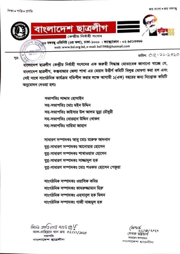 সেখানে উল্লেখ করা হয়, বাংলাদেশ ছাত্রলীগ কেন্দ্রীয় নির্বাহি সংসদের এক জরুরি সিদ্ধান্ত মোতাবেক জানানো যাচ্ছে যে, বাংলাদেশ ছাত্রলীগ কক্সবাজার জেলা শাখার মেয়াদ উত্তীর্ণ কমিটি বিলুপ্ত ঘোষণা করা হল এবং সেই সাথে সাংগঠনিক কার্যক্রম গতিশীল করার লক্ষ্যে আগামী একবছরের জন্য নিম্নোক্ত কমিটি অনুমোদন দেওয়া হল-