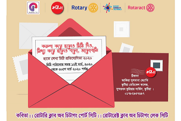 কবিতা পেজ আয়োজিত ‘করুণা করে হলেও, চিঠি দিও, মিথ্যা করে হলেও বোলো ভালোবাসি’ এ শিরোনামে একটি হাতে লেখা চিঠি প্রতিযোগিতায় অংশগ্রহণ করতে পারে যে কেউ। দেশ-বিদেশের সবাই নিজের চিঠি পাঠিয়ে দিতে পারবে কুরিয়ারে এবং ইমেইলে।
