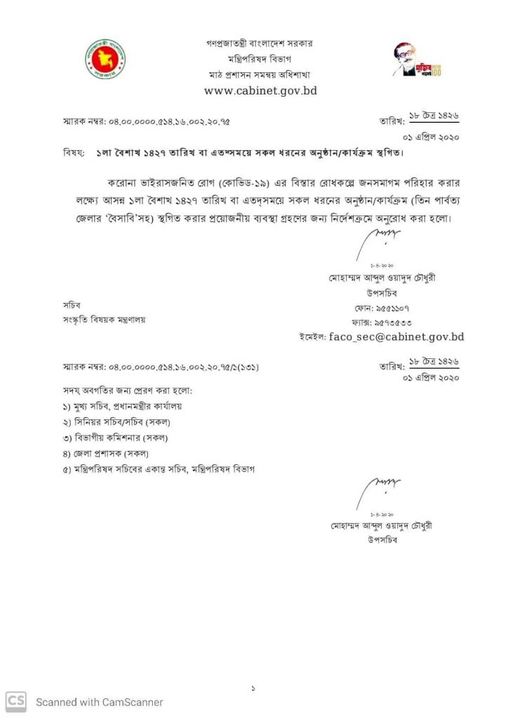 মন্ত্রিপরিষদের নির্দেশনায় করোনার বিস্তার রোধে জনসমাগম এড়িয়ে চলার পহেলা বৈশাখসহ এই সময়ের সব ধরনের অনুষ্ঠান (তিন পার্বত্য জেলার বৈসাবিসহ) স্থগিত করার প্রয়োজনীয় ব্যবস্থা নেওয়ার কথা বলা হয়েছে।
