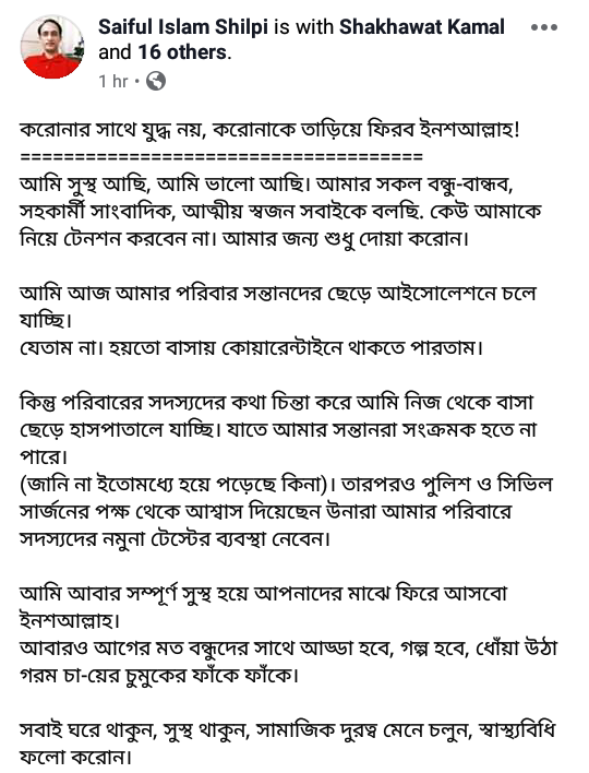 ‘আমি আজ আমার পরিবার সন্তানদের ছেড়ে আইসোলেশনে চলে যাচ্ছি। যেতাম না। হয়তো বাসায় কোয়ারেন্টাইনে থাকতে পারতাম। কিন্তু পরিবারের সদস্যদের কথা চিন্তা করে আমি নিজ থেকে বাসা ছেড়ে হাসপাতালে যাচ্ছি। যাতে আমার সন্তানরা সংক্রমক হতে না পারে (জানি না ইতোমধ্যে হয়ে পড়েছে কিনা)। তারপরও পুলিশ ও সিভিল সার্জনের পক্ষ থেকে আশ্বাস দিয়েছেন উনারা আমার পরিবারে সদস্যদের নমুনা টেস্টের ব্যবস্থা নেবেন।