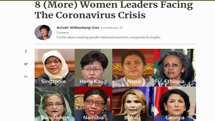 এর আগে যুক্তরাষ্ট্রের জনপ্রিয় ফোর্বস ম্যাগাজিন দাবি করছে, বিশ্বের যে সব দেশে করোনার লাগাম টেনে ধরতে পেরেছে সেগুলোর নেতৃত্বে রয়েছে নারীরা। ম্যাগাজিনটিতে উদাহরণস্বরূপ জার্মান, তাইওয়ান, আইসল্যান্ড , নিউজিল্যান্ড, ফিনল্যান্ড ও ডেনমার্কের কথা বলা হয়।