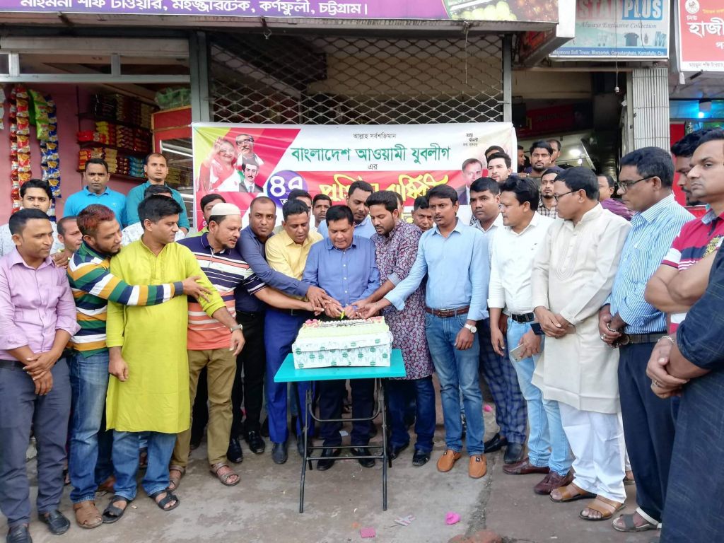 কেক কেটে বাংলাদেশ আওয়ামী যুবলীগের ৪৭তম প্রতিষ্ঠাবার্ষিকী উদযাপন করেছে কর্ণফুলী উপজেলা যুবলীগ।