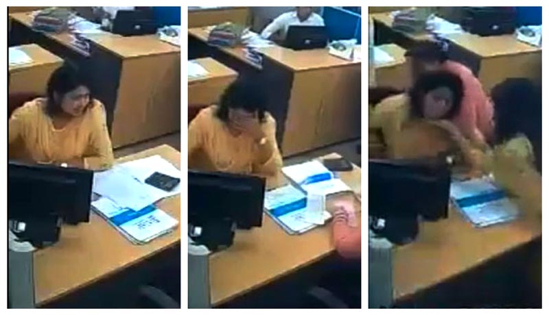বেলা ১২টা ৩৩ মিনিট। ব্যাংকের ডেস্কে বসে কাজ করছেন একজন নারী কর্মকর্তা। একজন নারী গ্রাহকের কাগজপত্র নিয়ে নেড়েচেড়ে দেখছিলেন তিনি। এ সময় একাধিকবার গালে, নাকে-মুখে, চোখে হাত দিতে দেখা যায় তাকে। পাশে রাখা গ্লাস থেকে তিনবার পানি পান করেন তিনি। আরেকবার পানি পানের সময় তার মাথা সামনে ঝুঁকে আসে। এ সময় টেবিলে মাথা রেখে নুইয়ে পড়েন তিনি। সঙ্গে সঙ্গে ওই নারী গ্রাহকসহ আশপাশের সহকর্মীরা এগিয়ে আসেন। তাকে সোজা করে চেয়ারে বসানোর চেষ্টা করেন একজন। কিন্তু চেয়ার থেকে নিচে পড়ে যান তিনি।