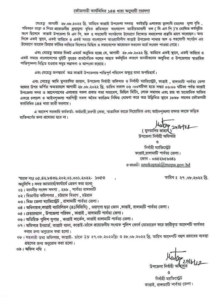 তাই জনস্বার্থে কাপ্তাই উপজেলায় শান্তিপূর্ণ পরিবেশ অক্ষুন্ন রাখার স্বার্থে রোববার সকাল ৬টা হতে সন্ধ্যা ৬টা পর্যন্ত কাপ্তাই উপজেলা সদর এবং এর আশেপাশের এলাকায় সকল প্রকার সভা-সমাবেশ, মিছিল, লোক সমাগম, চার বা ততোধিক ব্যক্তির একত্রে চলাচল এবং আইনশৃঙ্খলা পরিপন্থী সকল অবৈধ কার্যক্রম নিষিদ্ধ ঘোষণা করে অত্র উল্লিখিত স্থানে ১৮৯৮ সালের ফৌজদারী কার্যবিধির ১৪৪ ধারা জারি করা হয়।