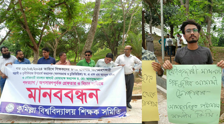 মনববন্ধনে শিক্ষক সমিতির সভাপতি অধ্যাপক ড মো আবু তাহের বলেন, ‘এই উপাচার্য প্রথমদিন থেকে বহিরাগত সন্ত্রাসদের সাথে যুক্ত এবং কুমিল্লা বিশ্ববিদ্যালয়ের বৈধ ছাত্রলীগের কমিটির বিলুপ্ত করার প্রচেষ্টা করছেন। শিক্ষক সমিতি যখন থেকে শিক্ষকদের দাবী নিয়ে কথা বলা শুরু করেছে তখন থেকেই উপাচার্য ক্ষুব্ধ প্রতিক্রিয়া ব্যক্ত করলেন। আমাদের দাবীগুলো নিয়ে মৌখিক ও লিখিত জানিয়েছি কিন্তু তিনি কোনো কর্ণপাত করেননি।’