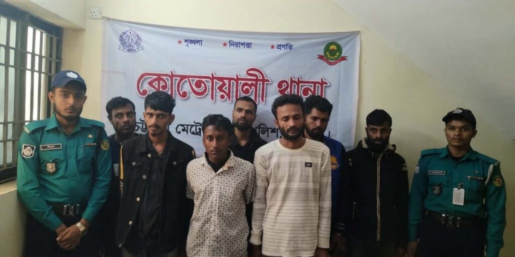 গ্রেপ্তাররা হলেন মো. আলাউদ্দিন (৩০), রমজান হোসেন রুবেল ওরফে দাইত্যা রুবেল (৩২), মো. জাহাঙ্গীর আলম (৩৫), জাহিদুল ইসলাম (২৭), মো. শান্ত (১৯), মো. মঞ্জুর আলম (৩০) ও মো. শরীফ (৩০)।