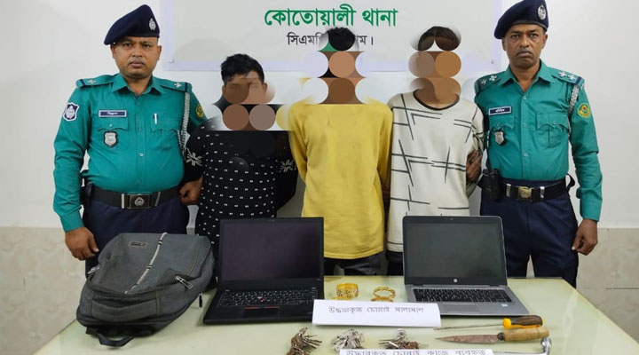 কোতোয়ালী থানার ভারপ্রাপ্ত কর্মকর্তা (ওসি) ওবায়দুল হক বলেন, গত শনিবার থানা এলাকার ১০ হোমসেন লেইনের মোমিন রোডের নোকিয়ার এক কর্মকর্তার বাসা থেকে দুপুর সাড়ে ১২টার দিকে অজ্ঞাত ব্যক্তিরা নগদ টাকা, ল্যাপটপ, সোনার চুড়ি চুরি করেছে এমন অভিযোগে থানায় মামলা করেন তানভীর ইসলাম নামের এক ব্যক্তি। মামলার তদন্তে নেমে সিসিটিভি ফুটেজ চেক করে ঘটনার সত্যতা মেলে। ফুটেজে চোরচক্রের এক সদস্যকে সনাক্ত করা গেলে নগরীর কোতোয়ালী থানাধীন খাতুনগঞ্জ এলাকায় অভিযান পরিচালনা করে ৩ জনকে গ্রেফতার করা হয়।