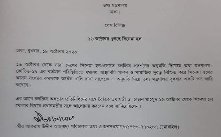 বুধবার (১৪ অক্টোবর) সিনেমা হল খোলার অনুমতি দিয়ে পত্র জারি করেছে তথ্য মন্ত্রণালয়।