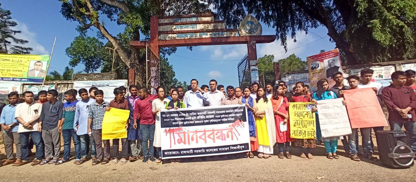 মানববন্ধনে আন্দোলনরত শিক্ষক-শিক্ষার্থীরা অভিলম্বে ঘাতক ট্রাক ড্রাইভারকে আইনের আওতায় এনে দৃষ্টান্তমূলক শাস্তির দাবি জানিয়েছে।