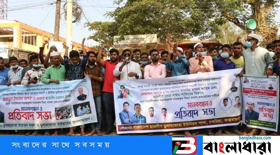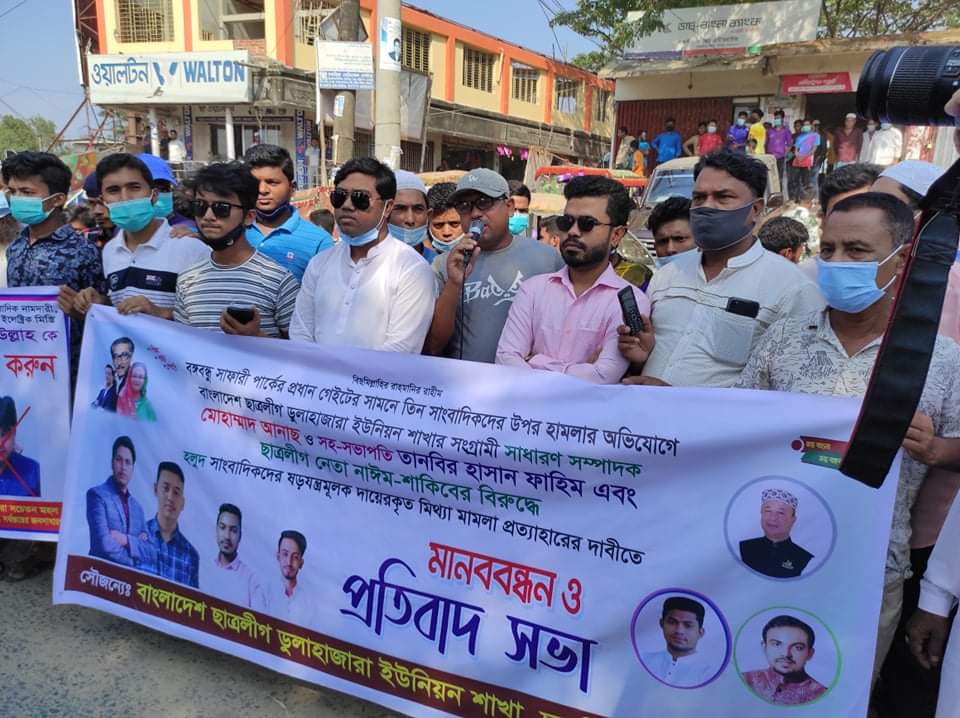 মানববন্ধনে ডুলহাজারা ইউনিয়ন আওয়ামীলীগের ভারপ্রাপ্ত সভাপতি ডা. আজিজুল মান্নান বলেন, সাংবাদিকরা জাতির বিবেক। তাদের প্রতি আমাদের বিশ্বাস ও আস্থা রয়েছে। কিন্তুু সাংবাদিক নামধারী কিছু দুর্বৃত্ত এ মহান পেশাটিকে প্রশ্নবিদ্ধ করে চলছে। একটি চক্রের স্বার্থে সাংবাদিক নামধারী তিন দুর্বৃত্ত যুবলীগ নেতা আদরসহ যুবলীগ-ছাত্রলীগের ১০জন নেতার বিরুদ্ধে একটি মামলা দায়ের করেছে।