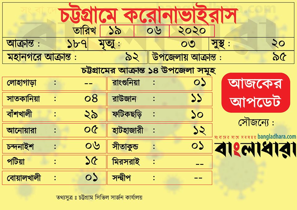 নতুন আক্রান্তদের মধ্যে ৯২ জন চট্টগ্রাম নগরীর এবং ৯৫ জন বিভিন্ন উপজেলার বাসিন্দা।