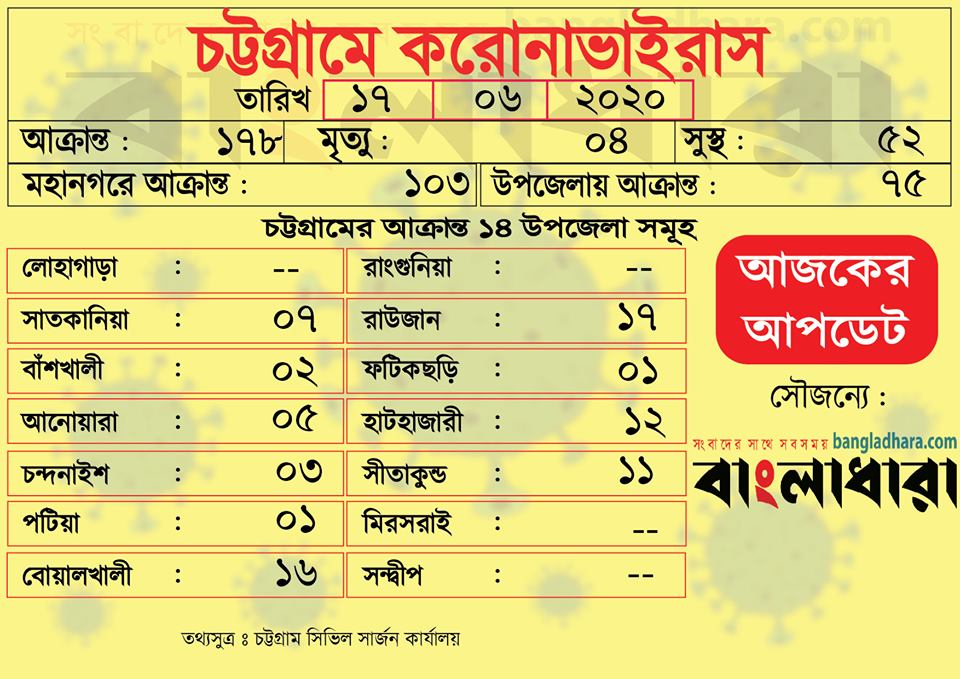 কক্সবাজার মেডিক্যাল কলেজ ল্যাবসহ চট্টগ্রামে ৬টি ল্যাবে ৭৯৬ টি নমুনা পরীক্ষা করে ১৭৮ জনের করোনা পজেটিভ পাওয়া গেছে। আক্রান্তদের ১০৩ জন মহানগরীর এবং ৭৫ জন বিভিন্ন উপজেলার বাসিন্দা।