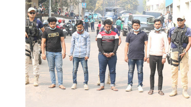 গ্রেপ্তারকৃতরা হলেন চট্টগ্রামের হাটহাজারী উপজেলার সরকারহাট গ্রামের সাগর আহমেদ জোভান (২৩), নড়াইল জেলার লোহাগাড়া থানার দিঘুলিয়া ইউনিয়নের শেখ সেজান (২৩), কুমিল্লা তিতাস এলাকার বাসিন্দা কিন্তু বর্তমানে ঢাকা গ্রিন রোড এলাকার মেহেদী হাসান (২৩), সিরাজগঞ্জ জেলার রায়গঞ্জ থানার শাকিল হোসেন (২৩) ও ময়মনসিংহ ফুলপুর থানার বাসিন্দা-বর্তমানে গাজীপুর সিটি করপোরেশন এলাকার মাসুদ রানা (২৭)।