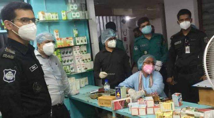 অন্যদিকে নির্বাহী ম্যাজিস্ট্রেট মো. উমর ফারুকের নেতৃত্বে পরিচালিত ভ্রাম্যমাণ আদালত নকল পিপিই-মাস্ক বিক্রি, মেয়াদোত্তীর্ণ ওষুধ বিক্রি, বেশি দামে ওষুধ বিক্রিসহ কয়েকটি অপরাধের দায়ে ১০টি ফার্মেসিকে ৩ লাখ ৪৩ হাজার টাকা জরিমানা করে।