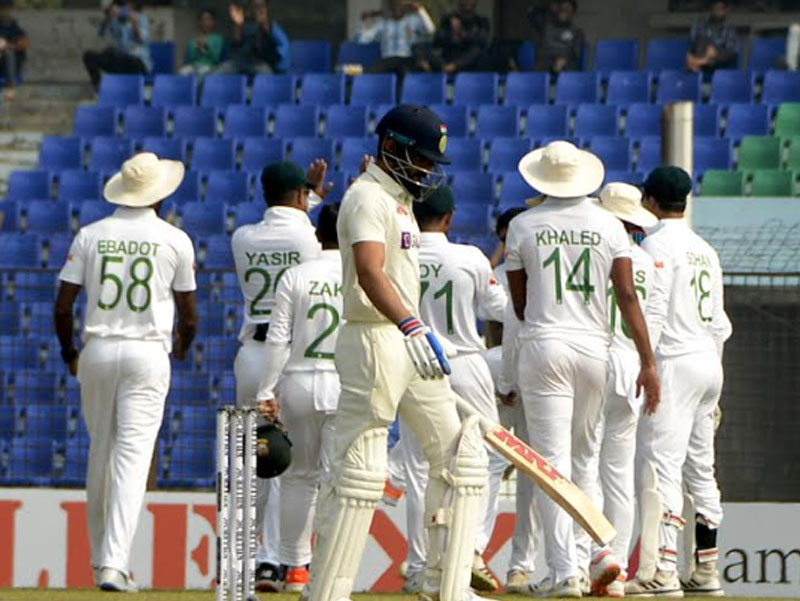 খানিক বাদে খালেদ আহমেদের লেংথ বলে ইনসাইড অ্যাজ হয়ে বোল্ড লোকেশ রাহুল। রাহুল ৫৪ বলে ২২ রান করে ফেরার পরপরই বড় উল্লাসটা করেছে বাংলাদেশ। তাইজুল ইসলামের জোরের ওপর করা বলটি বিরাট কোহলির ব্যাটকে ফাঁকি দিয়ে আঘাত হানে প্যাডে। মিডল স্ট্যাম্পে থাকায় আঙুল তুলে দিতে দেরি করেননি আম্পায়ার। কোহলি চেতেশ্বর পুজারার সঙ্গে পরামর্শ করে অবশ্য রিভিউ নিলেন। তবে তাতে লাভ হয়নি। ৫ বলে ১ রান করে আউট ভারতের সেরা ব্যাটার।