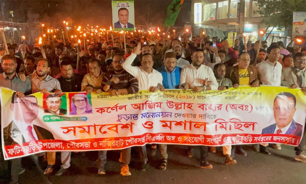 চট্টগ্রামের ফটিকছড়িতে বিএনপির ঘোষিত মনোনয়ন পরিবর্তনের দাবিতে মশাল মিছিল করেছে উপজেলা বিএনপির আহ্বায়ক কর্নেল (অব.) আজিম উল্লাহ বাহারের অনুসারী নেতাকর্মী ও সমর্থকরা।